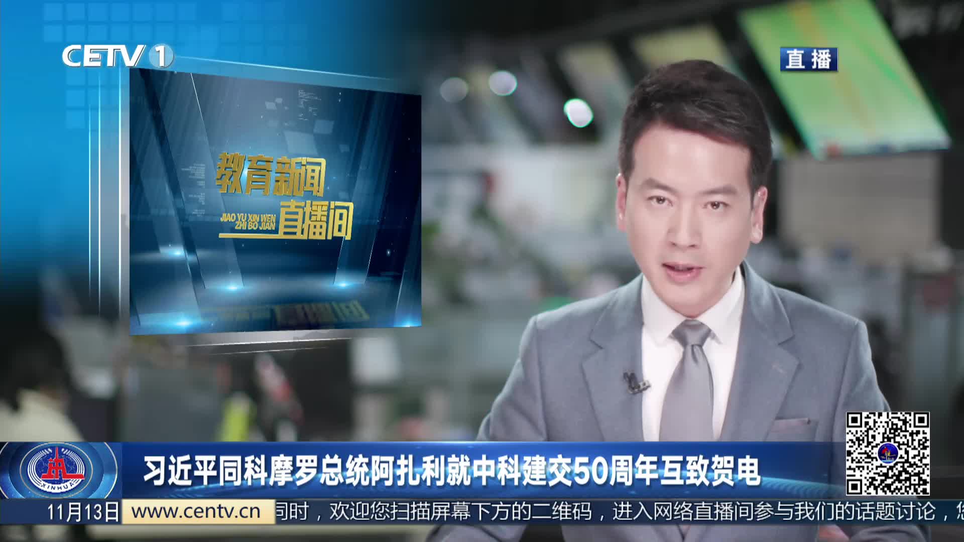 11月13日,国家主席习近平同科摩罗总统阿扎利互致贺电,庆祝两国建交50周年。