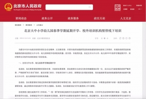 经北京市委、市政府同意,决定全市大中小学、幼儿园2020年春季学期延期开学,同时暂停全市校外培训机构线下培训活动。