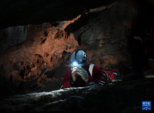 2025年12月,航天员在洞穴中进行物品传递协作训练。新华社发