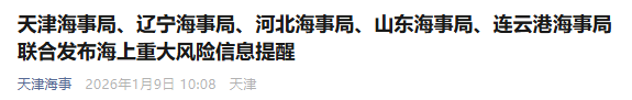 今天(1月9日),天津海事局、辽宁海事局、河北海事局、山东海事局、连云港海事局联合发布海上重大风险信息提醒。