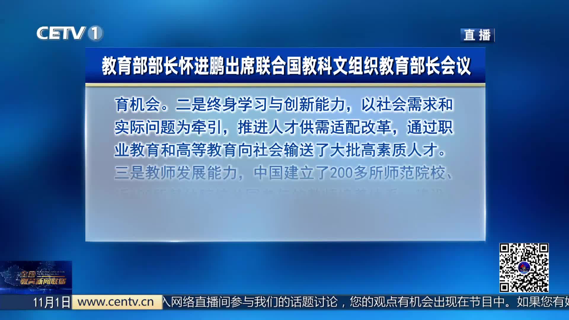 近日,联合国教科文组织第43届大会在乌兹别克斯坦撒马尔罕举行。当地时间10月31日,教育部部长怀进鹏出席大会期间举办的教育部长会议并发言。