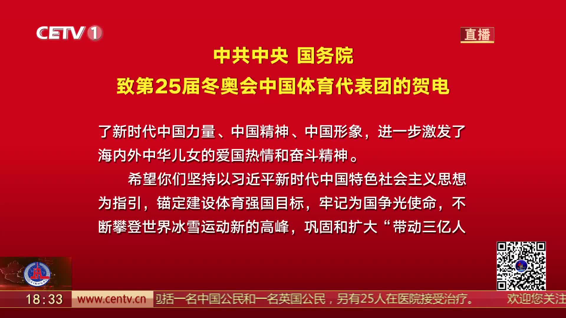 中共中央 国务院2月23日向第25届冬奥会中国体育代表团致贺电。