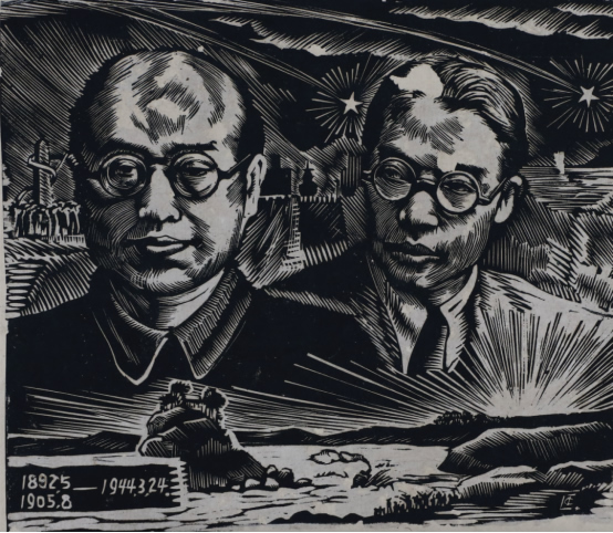李家桢《唐氏二兄弟——罹难的武昌艺专校长唐义精、教授唐一禾》木刻版画 24.3cm×27.5cm 1944年 湖北美术学院藏